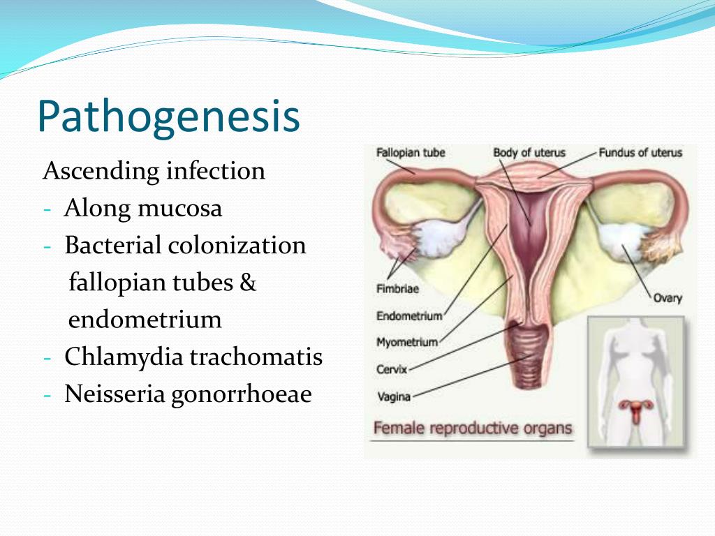 Pathogenesis Ascending infection • Along mucosa • Bacterial colonization fallopian tubes & endometrium • Chlamydia trachomatis • Neisseria gonorrhoeae