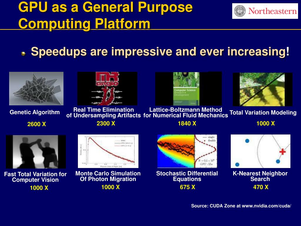 GPU as a General Purpose Computing Platform • Speedups are impressive and ever increasing! Real Time Elimination of Undersampling Artifacts Lattice-Boltzmann Method for Numerical Fluid Mechanics Genetic Algorithm Total Variation Modeling 2300 X 1840 X 1000 X 2600 X Monte Carlo Simulation Of Photon Migration Stochastic Differential Equations K-Nearest Neighbor Search Fast Total Variation for Computer Vision 1000 X 675 X 470 X 1000 X Source: CUDA Zone at www.nvidia.com/cuda/