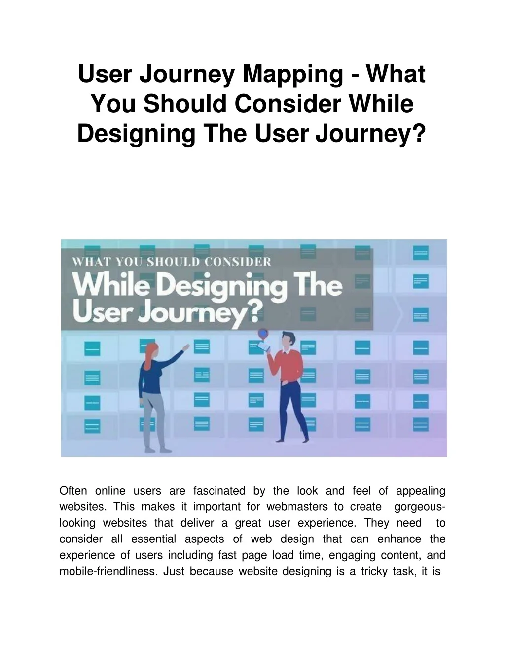 User Journey Mapping -What You Should ConsiderWhile Designing The UserJourney? Often online users are fascinated by the look and feel of appealing websites. This makes it important for webmasters to create gorgeous-looking websites that deliver a great user experience. They need to consider all essential aspects of web design that can enhance the experience of users including fast page load time, engaging content, and mobile-friendliness.Justbecausewebsitedesigningisatrickytask,itis