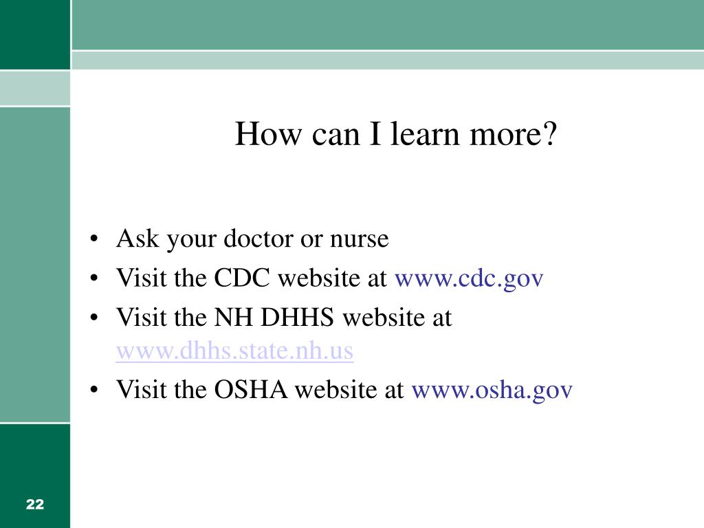 How can I learn more? • Ask your doctor or nurse • Visit the CDC website at www.cdc.gov • Visit the NH DHHS website at www.dhhs.state.nh.us • Visit the OSHA website at www.osha.gov