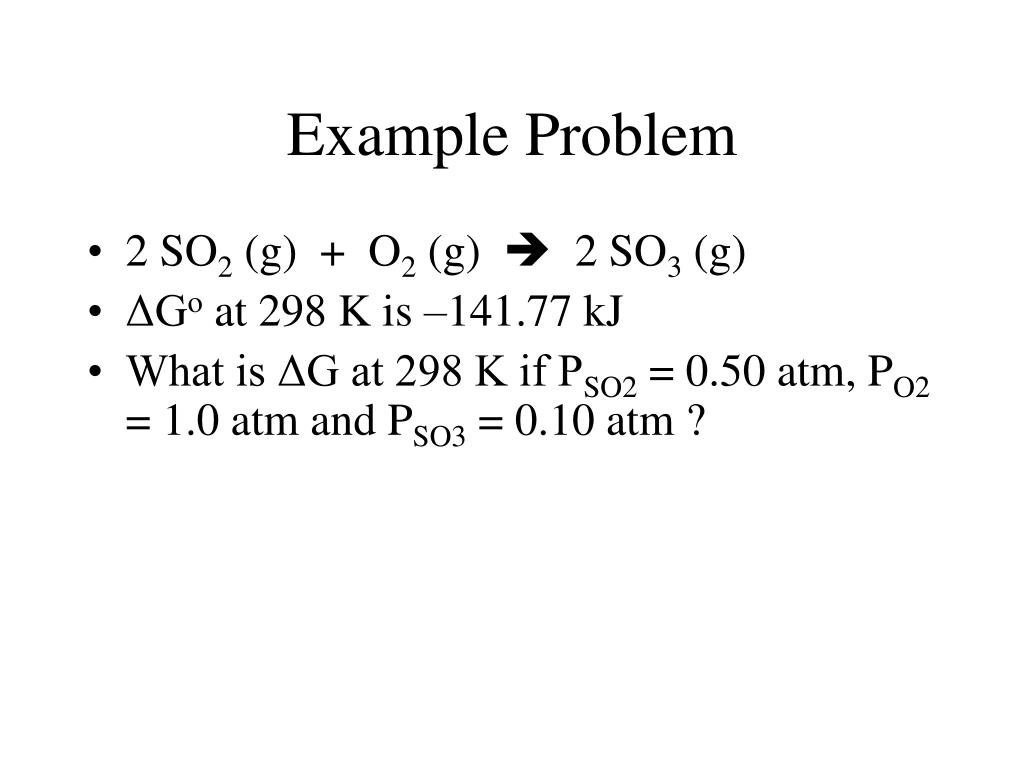 Example Problem • 2 SO2 (g) + O2 (g) 2 SO3 (g) • ΔGo at 298 K is –141.77 kJ • What is ΔG at 298 K if PSO2 = 0.50 atm, PO2 = 1.0 atm and PSO3 = 0.10 atm ?