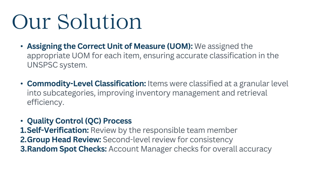 Our Solution • Assigning the Correct Unit of Measure (UOM):We assigned the appropriate UOM for each item, ensuring accurate classification in the UNSPSC system. • Commodity-Level Classification:Items were classified at a granular level into subcategories, improving inventory management and retrieval efficiency. • Quality Control (QC) Process • Self-Verification:Review by the responsible team member • Group Head Review: Second-level review for consistency • Random Spot Checks: Account Manager checks for overall accuracy