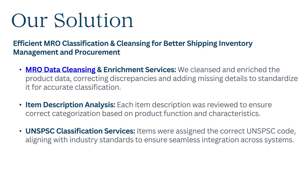 Our Solution • Efficient MRO Classification & Cleansing for Better Shipping Inventory Management and Procurement • MRO Data Cleansing & Enrichment Services:We cleansed and enriched the product data, correcting discrepancies and adding missing details to standardize it for accurate classification. • Item Description Analysis: Each item description was reviewed to ensure correct categorization based on product function and characteristics. • UNSPSC Classification Services:Items were assigned the correct UNSPSC code, aligning with industry standards to ensure seamless integration across systems.