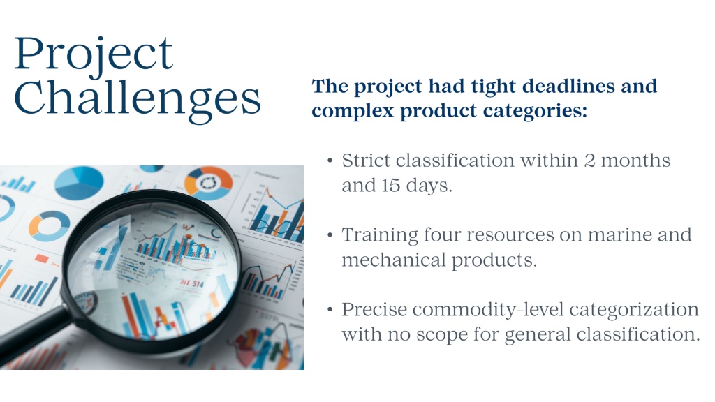 Project Challenges • The project had tight deadlines and complex product categories: • Strict classification within 2 months and 15 days. • Training four resources on marine and mechanical products. • Precise commodity-level categorization with no scope for general classification.