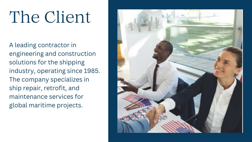 The Client • A leading contractor in engineering and construction solutions for the shipping industry, operating since 1985. The company specializes in ship repair, retrofit, and maintenance services for global maritime projects.