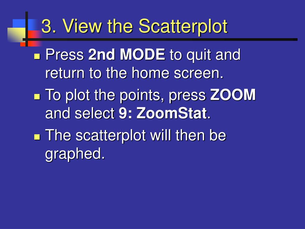 3. View the Scatterplot • Press 2nd MODE to quit and return to the home screen. • To plot the points, press ZOOM and select 9: ZoomStat. • The scatterplot will then be graphed.