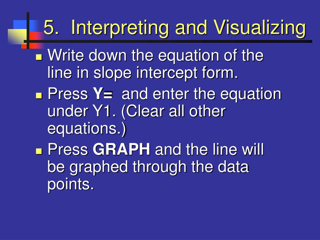 5. Interpreting and Visualizing • Write down the equation of the line in slope intercept form. • Press Y= and enter the equation under Y1. (Clear all other equations.) • Press GRAPH and the line will be graphed through the data points.