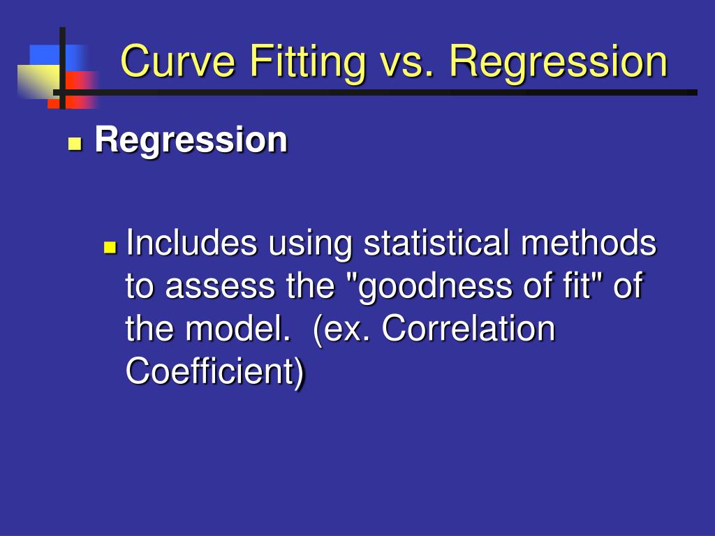 Curve Fitting vs. Regression • Regression • Includes using statistical methods to assess the "goodness of fit" of the model. (ex. Correlation Coefficient)