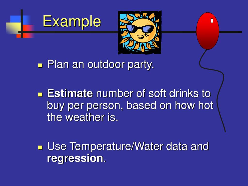 Example • Plan an outdoor party. • Estimate number of soft drinks to buy per person, based on how hot the weather is. • Use Temperature/Water data and regression.