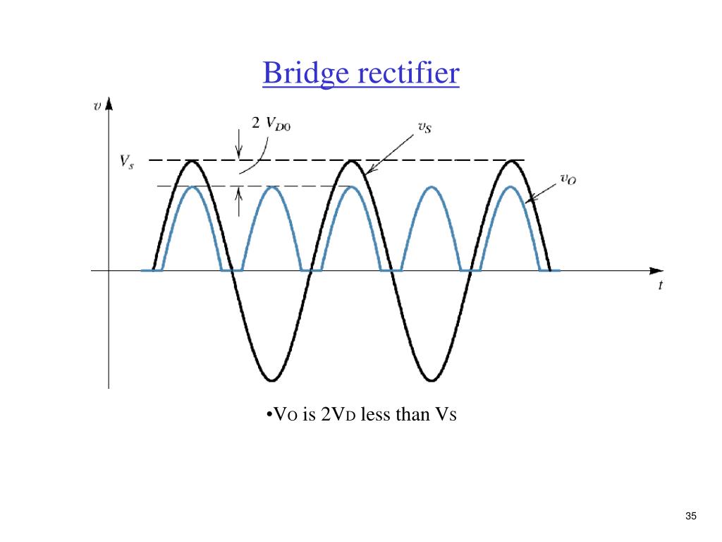 Bridge rectifier VS > 0 D1, D2 on; D3, D4 off VS < 0 D3, D4 on; D1, D2 off • A type of full-wave rectifier • Center-tap not needed • Most popular rectifier
