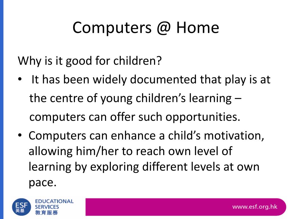 Computers @ Home Why is it good for children? • It has been widely documented that play is at the centre of young children’s learning – computers can offer such opportunities. • Computers can enhance a child’s motivation, allowing him/her to reach own level of learning by exploring different levels at own pace.