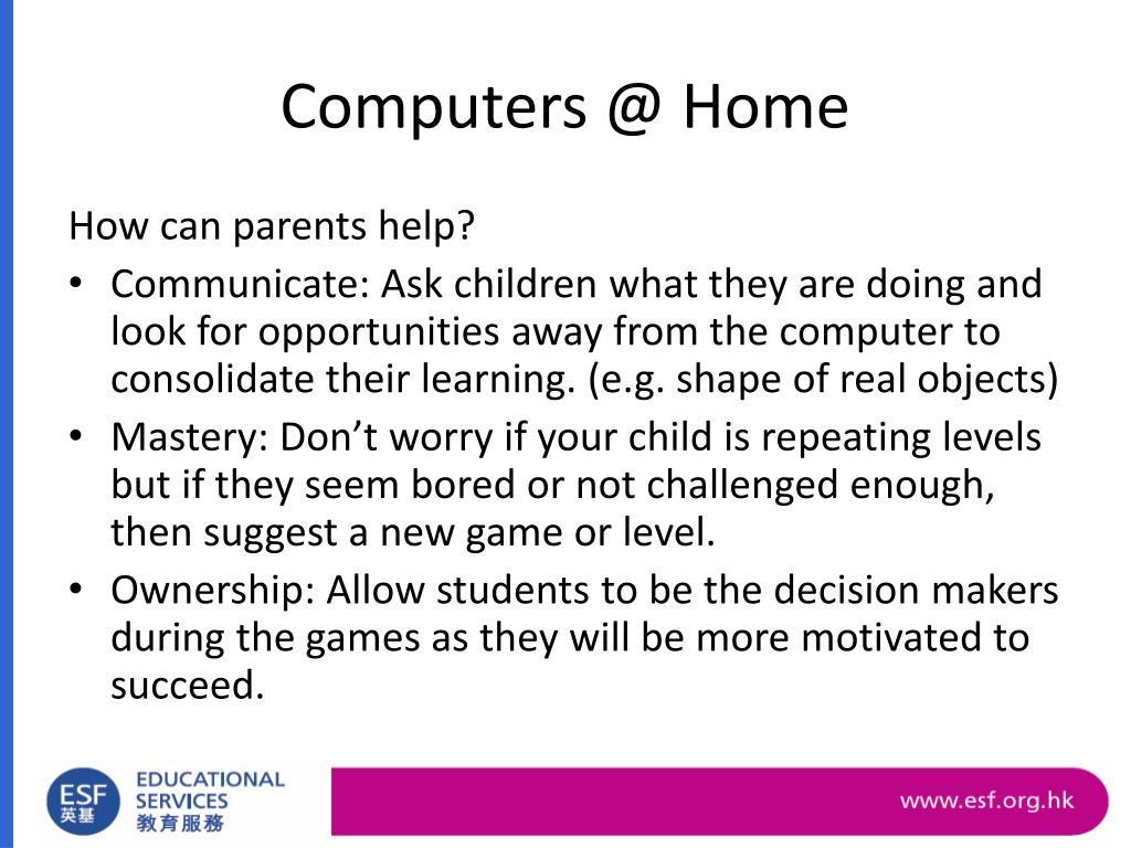 Computers @ Home How can parents help? • Communicate: Ask children what they are doing and look for opportunities away from the computer to consolidate their learning. (e.g. shape of real objects) • Mastery: Don’t worry if your child is repeating levels but if they seem bored or not challenged enough, then suggest a new game or level. • Ownership: Allow students to be the decision makers during the games as they will be more motivated to succeed.