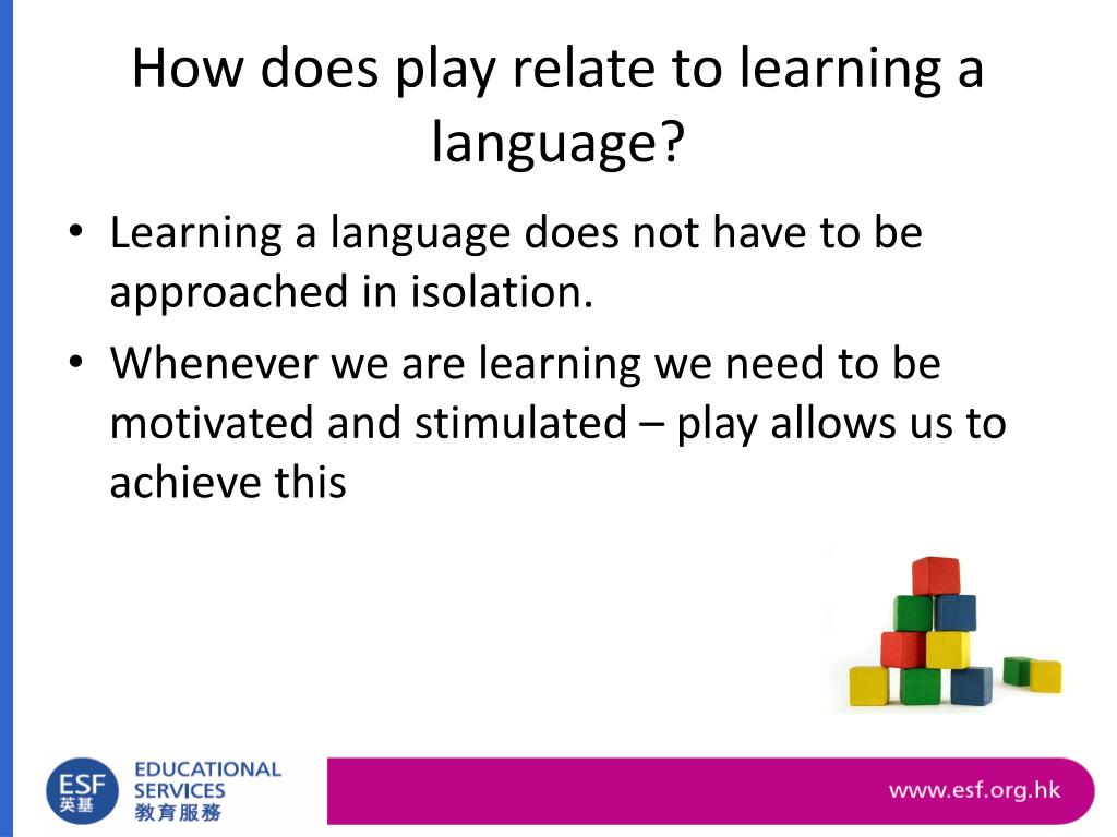 How does play relate to learning a language? • Learning a language does not have to be approached in isolation. • Whenever we are learning we need to be motivated and stimulated – play allows us to achieve this