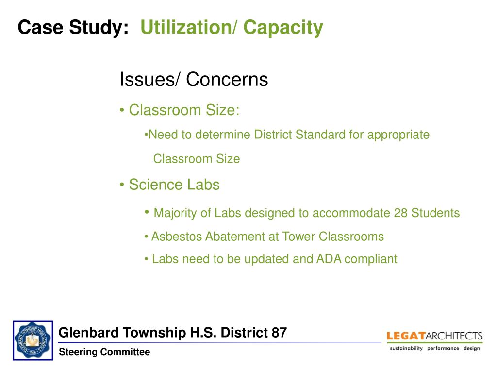 Case Study: Utilization/ Capacity • Issues/ Concerns • Classroom Size: • Need to determine District Standard for appropriate • Classroom Size • Science Labs • Majority of Labs designed to accommodate 24 Students • Labs need to be updated and ADA compliant • Labs should be appropriate for subject taught