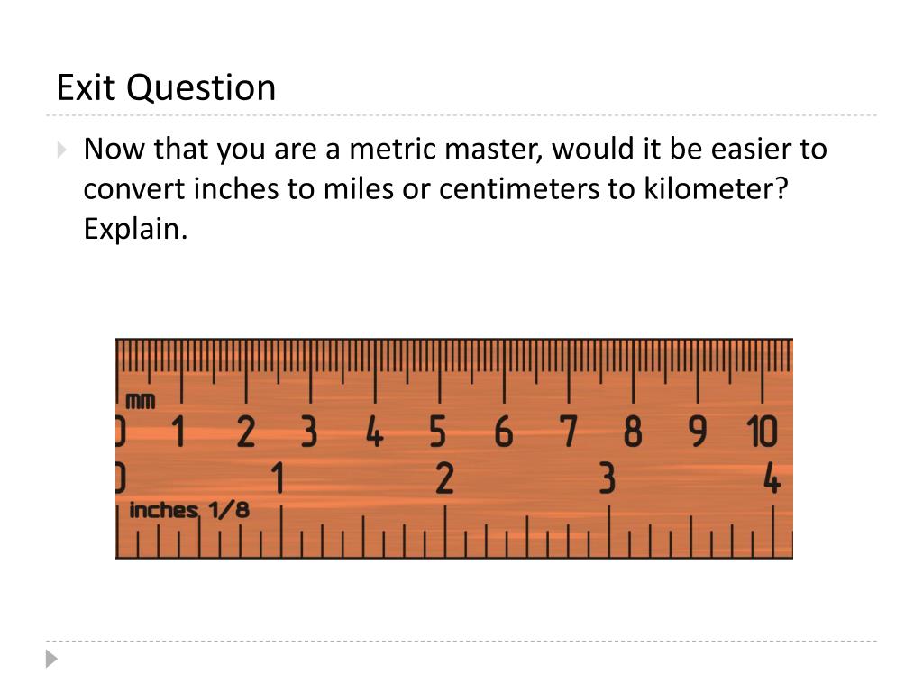 Exit Question • Now that you are a metric master, would it be easier to convert inches to miles or centimeters to kilometer? Explain.