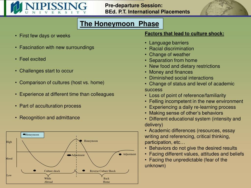 Pre-departure Session: BEd. P.T. International Placements Take time to learn the language. It always helps to understand as much as possible of what people are saying. They will appreciate your effort to communicate with them in their language, even if it is just a few simple phrases, and it will make your daily life much easier. Carry a small notebook and jot down a couple of new words each day. Use a phrase book to learn the vocabulary you need to cope with real-life situations. Make friends and develop relationships. Getting to know local people will help you overcome cultural differences and understand the country. It will also show you how to be more sensitive to cultural norms and expectations. Maintain contact with friends and family back home. Writing home about your experiences and problems can help you sort through them. It is also a good idea to keep a journal of your feelings and thoughts. Do something that reminds you of home. Listening to your favourite music or practising a familiar hobby can boost your spirits when you are feeling homesick. Avoid idealizing life back home. Try to make the most of your stay and consciously adopt an open mind. Get involved in some aspect of the new culture. Whether you study art or music, or learn a new sport or martial art, being an interested student will make a world of difference. Reference: http://www.voyage.gc.ca/main/living/culture_shock-en.asp