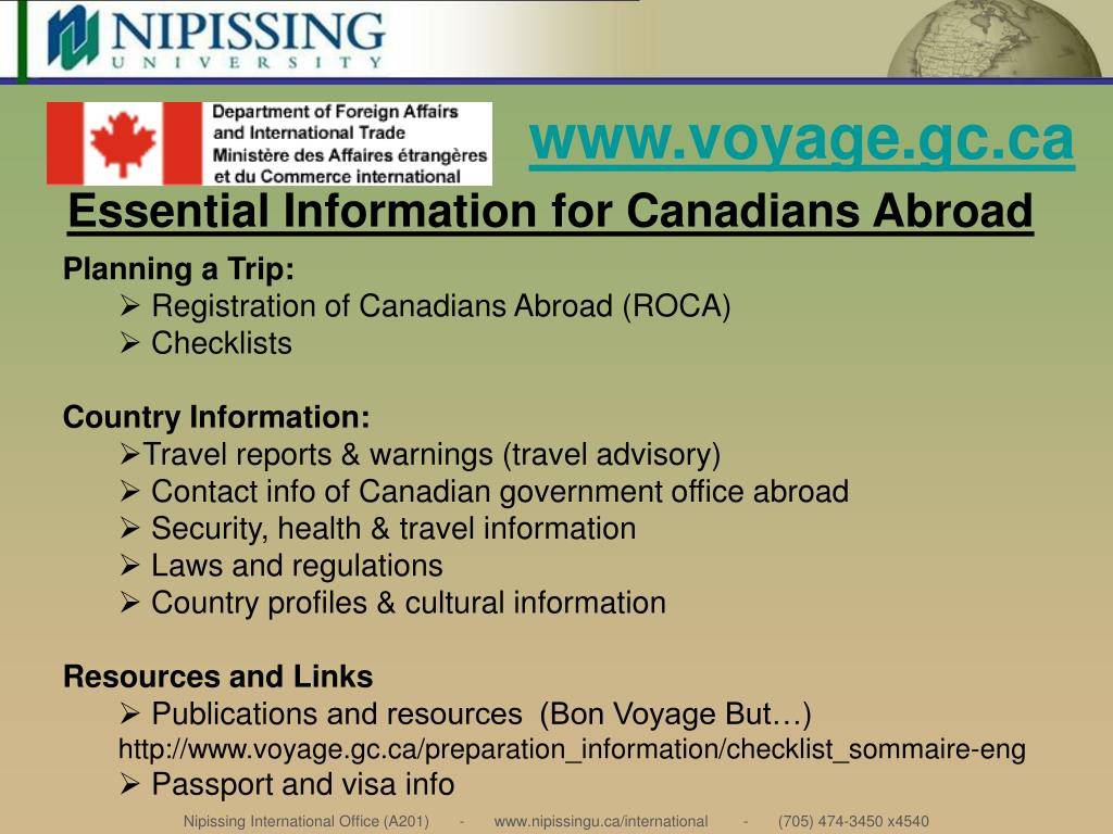 www.voyage.gc.ca Essential Information for Canadians Abroad Planning a Trip: • Registration of Canadians Abroad (ROCA) • Checklists Country Information: • Travel reports & warnings (travel advisory) • Contact info of Canadian government office abroad • Security, health & travel information • Laws and regulations • Country profiles & cultural information Resources and Links • Publications and resources (Bon Voyage But…)http://www.voyage.gc.ca/preparation_information/checklist_sommaire-eng • Passport and visa info Nipissing International Office (A201) - www.nipissingu.ca/international - (705) 474-3450 x4540