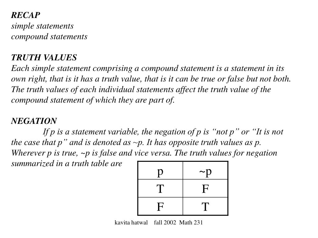 RECAP simple statements compound statements TRUTH VALUES Each simple statement comprising a compound statement is a statement in its own right, that is it has a truth value, that is it can be true or false but not both. The truth values of each individual statements affect the truth value of the compound statement of which they are part of. NEGATION If p is a statement variable, the negation of p is “not p” or “It is not the case that p” and is denoted as ~p. It has opposite truth values as p. Wherever p is true, ~p is false and vice versa. The truth values for negation summarized in a truth table are kavita hatwal fall 2002 Math 231