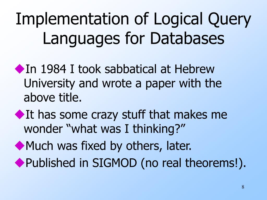 Implementation of Logical Query Languages for Databases • In 1984 I took sabbatical at Hebrew University and wrote a paper with the above title. • It has some crazy stuff that makes me wonder “what was I thinking?” • Much was fixed by others, later. • Published in SIGMOD (no real theorems!).