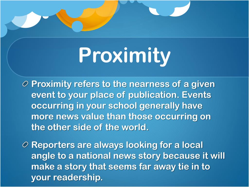 Proximity • Proximity refers to the nearness of a given event to your place of publication. Events occurring in your school generally have more news value than those occurring on the other side of the world. • Reporters are always looking for a local angle to a national news story because it will make a story that seems far away tie in to your readership.