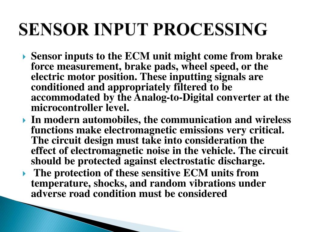 SENSOR INPUT PROCESSING • Sensor inputs to the ECM unit might come from brake force measurement, brake pads, wheel speed, or the electric motor position. These inputting signals are conditioned and appropriately filtered to be accommodated by the Analog-to-Digital converter at the microcontroller level. • In modern automobiles, the communication and wireless functions make electromagnetic emissions very critical. The circuit design must take into consideration the effect of electromagnetic noise in the vehicle. The circuit should be protected against electrostatic discharge. • The protection of these sensitive ECM units from temperature, shocks, and random vibrations under adverse road condition must be considered