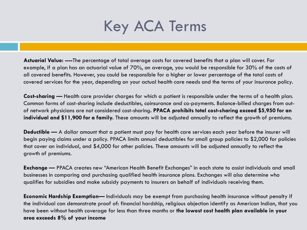 Key ACA Terms Actuarial Value: ----The percentage of total average costs for covered benefits that a plan will cover. For example, if a plan has an actuarial value of 70%, on average, you would be responsible for 30% of the costs of all covered benefits. However, you could be responsible for a higher or lower percentage of the total costs of covered services for the year, depending on your actual health care needs and the terms of your insurance policy. Cost-sharing — Health care provider charges for which a patient is responsible under the terms of a health plan. Common forms of cost-sharing include deductibles, coinsurance and co-payments. Balance-billed charges from out-of network physicians are not considered cost-sharing. PPACA prohibits total cost-sharing exceed $5,950 for an individual and $11,900 for a family. These amounts will be adjusted annually to reflect the growth of premiums. Deductible — A dollar amount that a patient must pay for health care services each year before the insurer will begin paying claims under a policy. PPACA limits annual deductibles for small group policies to $2,000 for policies that cover an individual, and $4,000 for other policies. These amounts will be adjusted annually to reflect the growth of premiums. Exchange — PPACA creates new “American Health Benefit Exchanges” in each state to assist individuals and small businesses in comparing and purchasing qualified health insurance plans. Exchanges will also determine who qualifies for subsidies and make subsidy payments to insurers on behalf of individuals receiving them. Economic Hardship Exemption— Individuals may be exempt from purchasing health insurance without penalty if the individual can demonstrate proof of: financial hardship, religious objection identify as American Indian, that you have been without health coverage for less than three months or the lowest cost health plan available in your area exceeds 8% of your income