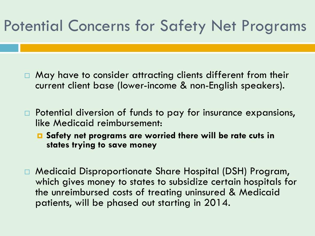 Potential Concerns for Safety Net Programs • May have to consider attracting clients different from their current client base (lower-income & non-English speakers). • Potential diversion of funds to pay for insurance expansions, like Medicaid reimbursement: • Safety net programs are worried there will be rate cuts in states trying to save money • Medicaid Disproportionate Share Hospital (DSH) Program, which gives money to states to subsidize certain hospitals for the unreimbursed costs of treating uninsured & Medicaid patients, will be phased out starting in 2014.
