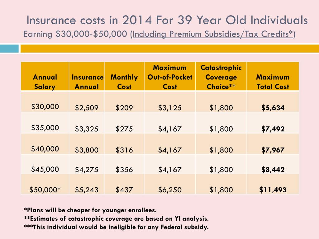 Insurance costs in 2014 For 39 Year Old Individuals Earning $30,000-$50,000 (Including Premium Subsidies/Tax Credits*) *Plans will be cheaper for younger enrollees. **Estimates of catastrophic coverage are based on YI analysis. ***This individual would be ineligible for any Federal subsidy.