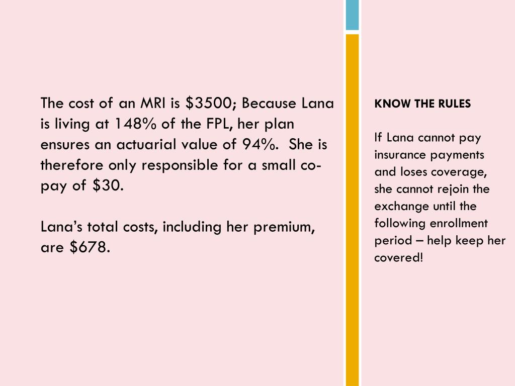 The cost of an MRI is $3500; Because Lana is living at 148% of the FPL, her plan ensures an actuarial value of 94%. She is therefore only responsible for a small co-pay of $30. • Lana’s total costs, including her premium, are $678. KNOW THE RULES If Lana cannot pay insurance payments and loses coverage, she cannot rejoin the exchange until the following enrollment period – help keep her covered!