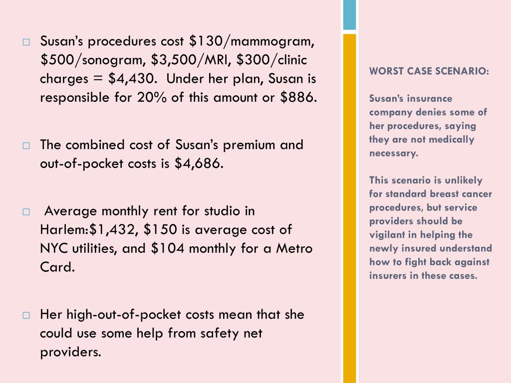 Susan’s procedures cost $130/mammogram, $500/sonogram, $3,500/MRI, $300/clinic charges= $4,430. Under her plan, Susan is responsible for 20% of this amount or $886. • The combined cost of Susan’s premium and out-of-pocket costs is $4,686. • Average monthly rent for studio in Harlem:$1,432, $150 is average cost of NYC utilities, and $104 monthly for a Metro Card. • Her high-out-of-pocket costs mean that she could use some help from safety net providers. WORST CASE SCENARIO:Susan’s insurance company denies some of her procedures, saying they are not medically necessary. This scenario is unlikely for standard breast cancer procedures, but service providers should be vigilant in helping the newly insured understand how to fight back against insurers in these cases.