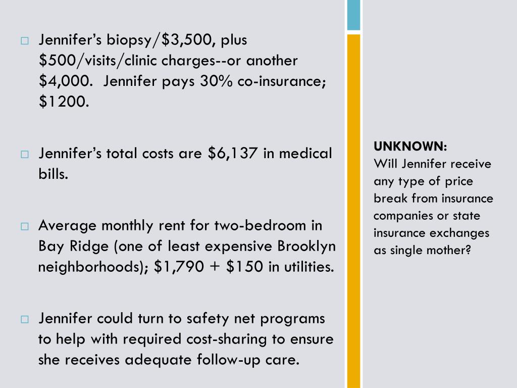Jennifer’s biopsy/$3,500, plus $500/visits/clinic charges--or another $4,000. Jennifer pays 30% co-insurance; $1200. • Jennifer’s total costs are $6,137 in medical bills. • Average monthly rent for two-bedroom in Bay Ridge(one of least expensive Brooklyn neighborhoods); $1,790 + $150 in utilities. • Jennifer could turn to safety net programs to help with required cost-sharing to ensure she receives adequate follow-up care. UNKNOWN:Will Jennifer receive any type of price break from insurance companies or state insurance exchanges as single mother?