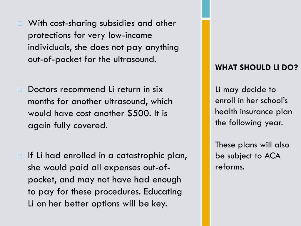With cost-sharing subsidies and other protections for very low-income individuals, she does not pay anything out-of-pocket for the ultrasound. • Doctors recommend Li return in six months for another ultrasound, which would have cost another $500. It is again fully covered. • If Li had enrolled in a catastrophic plan, she would paid all expenses out-of-pocket, and may not have had enough to pay for these procedures. Educating Li on her better options will be key. WHAT SHOULD LI DO? Li may decide to enroll in her school’s health insurance plan the following year. These plans will also be subject to ACA reforms.
