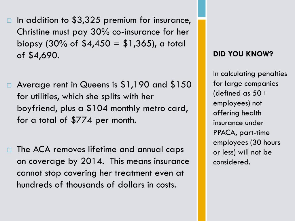 In addition to $3,325 premium for insurance, Christine must pay 30% co-insurance for her biopsy (30% of $4,450= $1,365), a total of $4,690. • Average rent in Queens is $1,190 and $150 for utilities, which she splits with her boyfriend, plus a $104 monthly metro card, for a total of $774 per month. • The ACA removes lifetime and annual caps on coverage by 2014. This means insurance cannot stop covering her treatment even at hundreds of thousands of dollars in costs. DID YOU KNOW?In calculating penalties for large companies (defined as 50+ employees) not offering health insurance under PPACA, part-time employees (30 hours or less) will not be considered.
