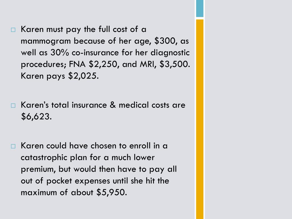 Karen must pay the full cost of a mammogram because of her age, $300, as well as 30% co-insurance for her diagnostic procedures; FNA $2,250, and MRI, $3,500. Karen pays $2,025. • Karen’s total insurance & medical costs are $6,623. • Karen could have chosen to enroll in a catastrophic plan for a much lower premium, but would then have to pay all out of pocket expenses until she hit the maximum of about $5,950.