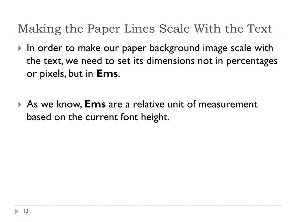 Making the Paper Lines Scale With the Text • In order to make our paper background image scale with the text, we need to set its dimensions not in percentages or pixels, but in Ems. • As we know, Ems are a relative unit of measurement based on the current font height.