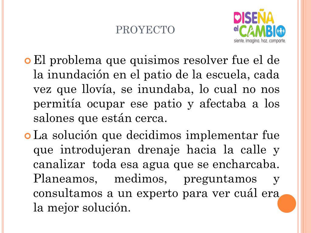 proyecto • El problema que quisimos resolver fue el de la inundación en el patio de la escuela, cada vez que llovía, se inundaba, lo cual no nos permitía ocupar ese patio y afectaba a los salones que están cerca. • La solución que decidimos implementar fue que introdujeran drenaje hacia la calle y canalizar toda esa agua que se encharcaba. Planeamos, medimos, preguntamos y consultamos a un experto para ver cuál era la mejor solución.