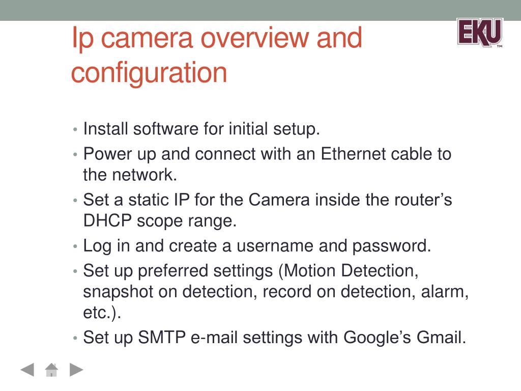 Ip camera overview and configuration • Install software for initial setup. • Power up and connect with an Ethernet cable to the network. • Set a static IP for the Camera inside the router’s DHCP scope range. • Log in and create a username and password. • Set up preferred settings (Motion Detection, snapshot on detection, record on detection, alarm, etc.). • Set up SMTP e-mail settings with Google’s Gmail.