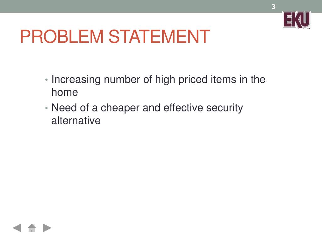 PROBLEM STATEMENT • Increasing number of high priced items in the home • Need of a cheaper and effective security alternative