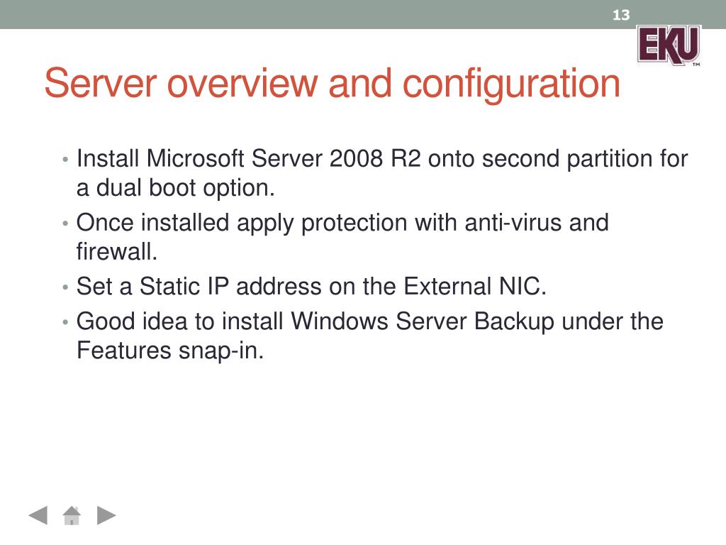 Server overview and configuration • Install Microsoft Server 2008 R2 onto second partition for a dual boot option. • Once installed apply protection with anti-virus and firewall. • Set a Static IP address on the External NIC. • Good idea to install Windows Server Backup under the Features snap-in.