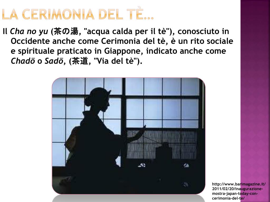 La cerimonia del tè… Il Cha no yu (茶の湯, "acqua calda per il tè"), conosciuto in Occidente anche come Cerimonia del tè, è un rito sociale e spirituale praticato in Giappone, indicato anche come Chadō o Sadō, (茶道, "Via del tè"). http://www.barimagazine.it/2011/02/20/inaugurazione-mostra-japan-today-con-cerimonia-del-te/