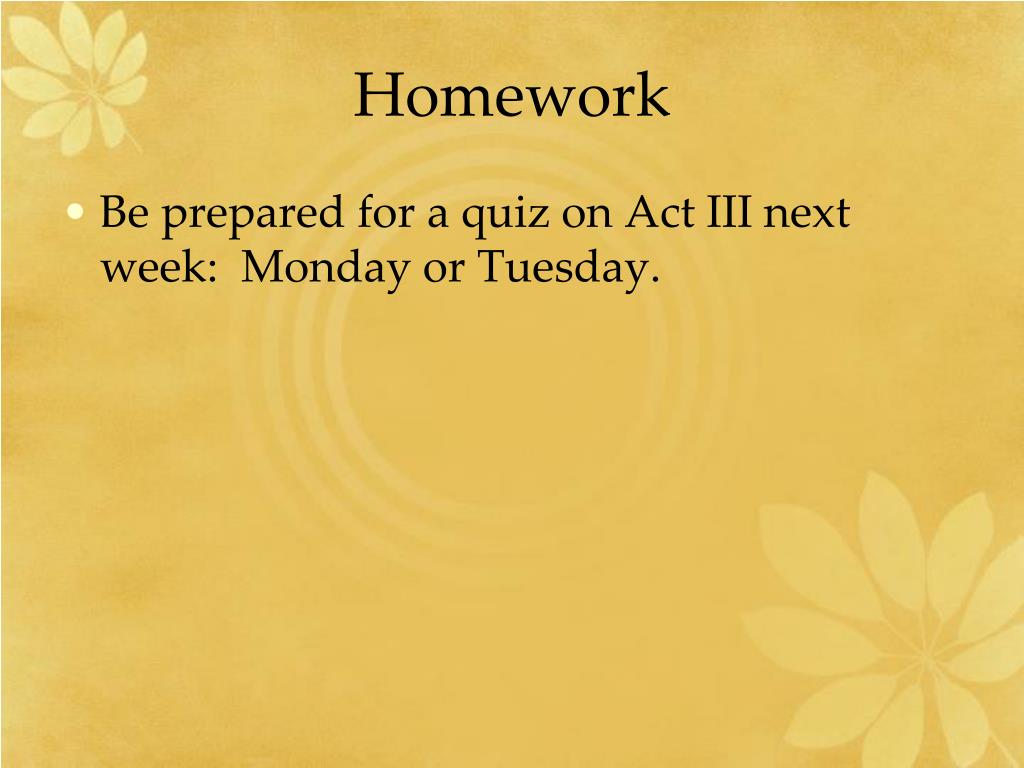 Homework • Be prepared for a quiz on Act III next week: Monday or Tuesday.