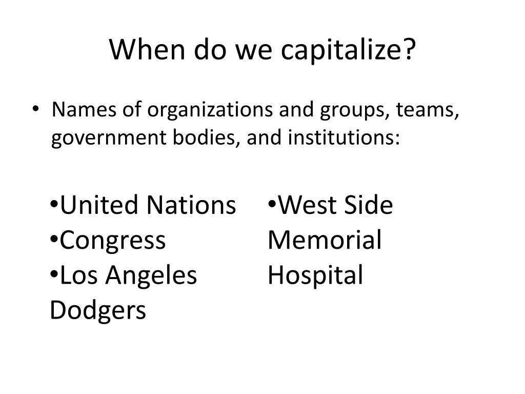 When do we capitalize? • Names of organizations and groups, teams, government bodies, and institutions: • United Nations • Congress • Los Angeles Dodgers • West Side Memorial Hospital