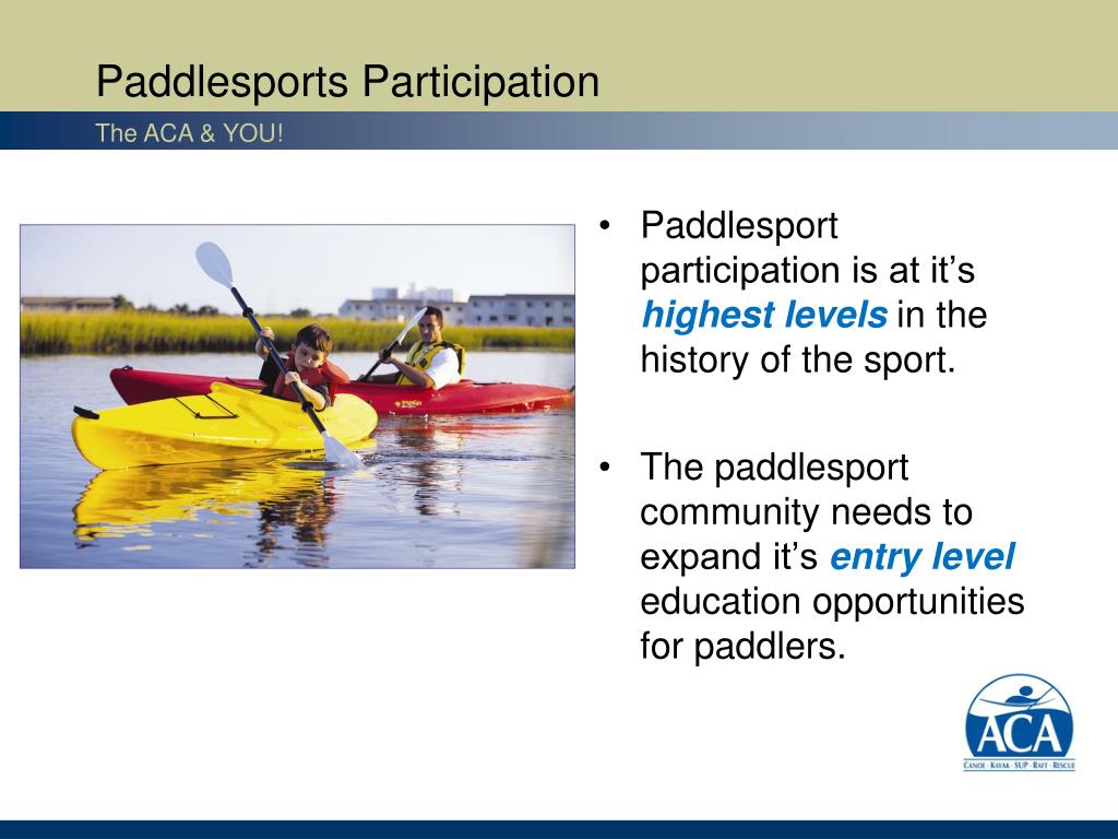 Paddlesports Participation The ACA & YOU! • Paddlesport participation is at it’s highest levelsin the history of the sport. • The paddlesport community needs to expand it’s entry level education opportunities for paddlers.