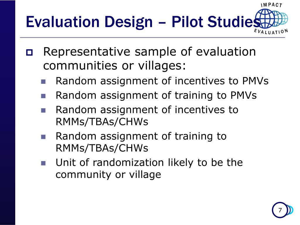 Evaluation Design – Pilot Studies • Representative sample of evaluation communities or villages: • Random assignment of incentives to PMVs • Random assignment of training to PMVs • Random assignment of incentives to RMMs/TBAs/CHWs • Random assignment of training to RMMs/TBAs/CHWs • Unit of randomization likely to be the community or village