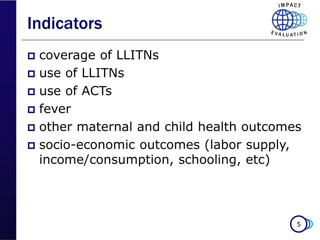 Indicators • coverage of LLITNs • use of LLITNs • use of ACTs • fever • other maternal and child health outcomes • socio-economic outcomes (labor supply, income/consumption, schooling, etc)