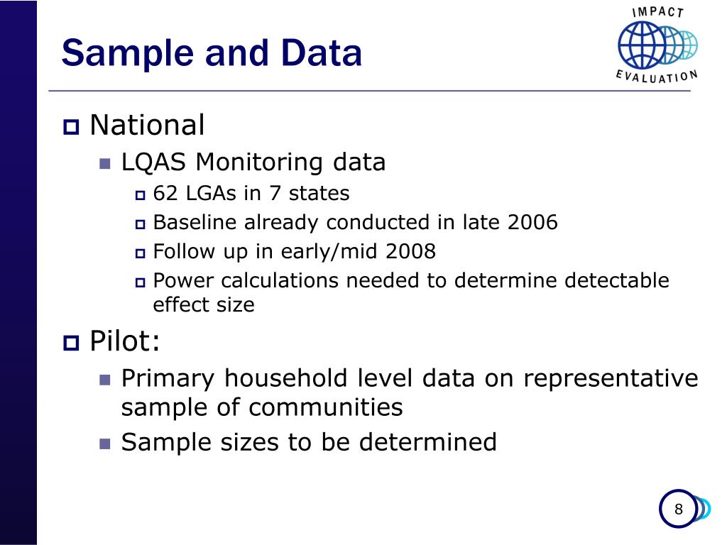 Sample and Data • National • LQAS Monitoring data • 62 LGAs in 7 states • Baseline already conducted in late 2006 • Follow up in early/mid 2008 • Power calculations needed to determine detectable effect size • Pilot: • Primary household level data on representative sample of communities • Sample sizes to be determined