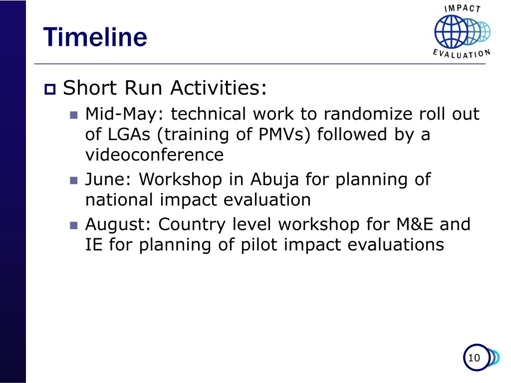 Timeline • Short Run Activities: • Mid-May: technical work to randomize roll out of LGAs (training of PMVs) followed by a videoconference • June: Workshop in Abuja for planning of national impact evaluation • August: Country level workshop for M&E and IE for planning of pilot impact evaluations