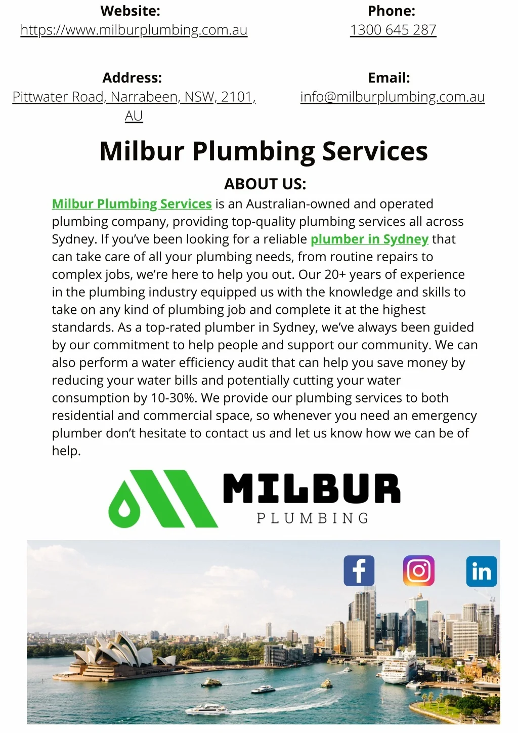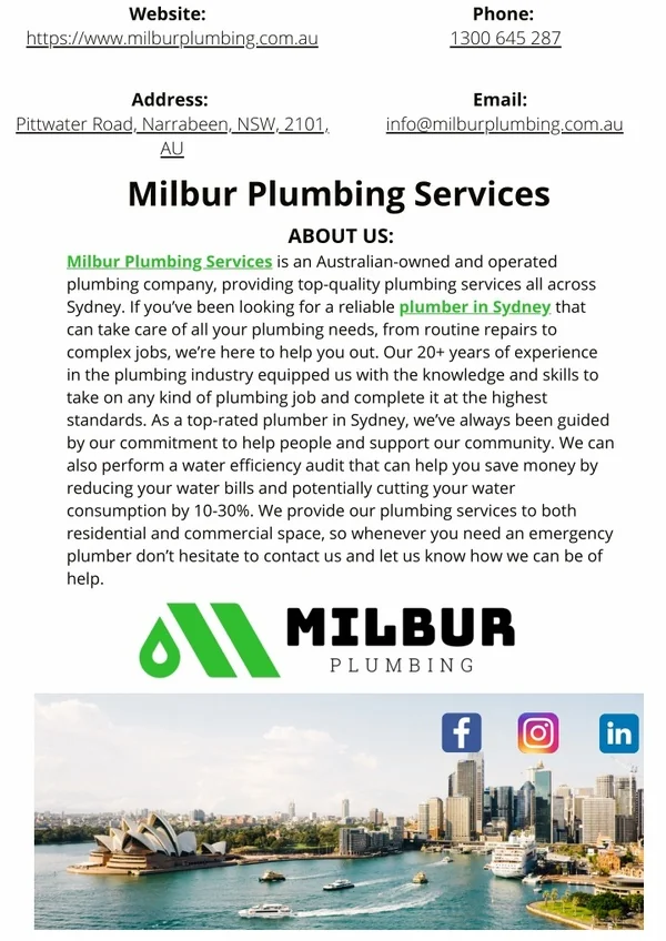 Website: Phone: 1300 645 287 https://www.milburplumbing.com.au Address: Email: Pittwater Road, Narrabeen, NSW, 2101, AU Milbur Plumbing Services info@milburplumbing.com.au ABOUT US: Milbur Plumbing Services is an Australian-owned and operated plumbing company, providing top-quality plumbing services all across Sydney. If you’ve been looking for a reliable plumber in Sydney that can take care of all your plumbing needs, from routine repairs to complex jobs, we’re here to help you out. Our 20+ years of experience in the plumbing industry equipped us with the knowledge and skills to take on any kind of plumbing job and complete it at the highest standards. As a top-rated plumber in Sydney, we’ve always been guided by our commitment to help people and support our community. We can also perform a water efficiency audit that can help you save money by reducing your water bills and potentially cutting your water consumption by 10-30%. We provide our plumbing services to both residential and commercial space, so whenever you need an emergency plumber don’t hesitate to contact us and let us know how we can be of help.