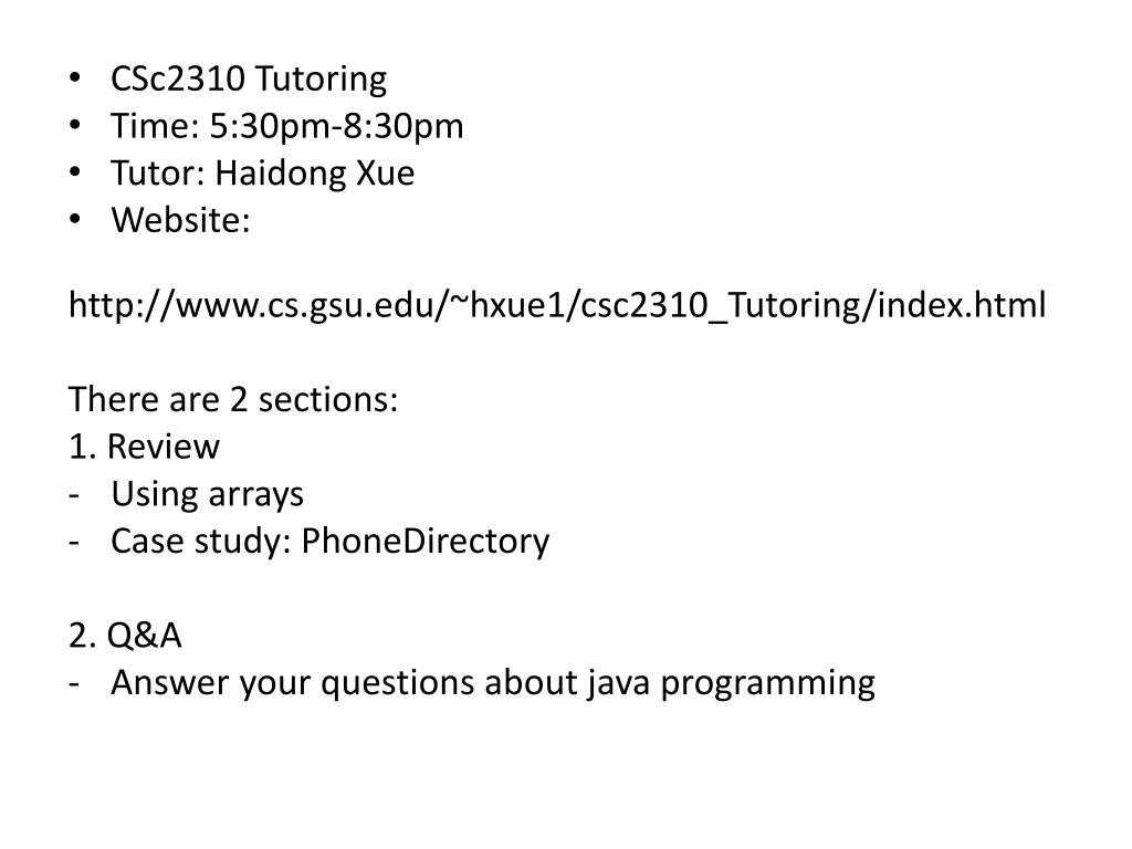 CSc2310 Tutoring • Time: 5:30pm-8:30pm • Tutor: HaidongXue • Website: http://www.cs.gsu.edu/~hxue1/csc2310_Tutoring/index.html There are 2 sections: 1. Review • Using arrays • Case study: PhoneDirectory 2. Q&A • Answer your questions about java programming
