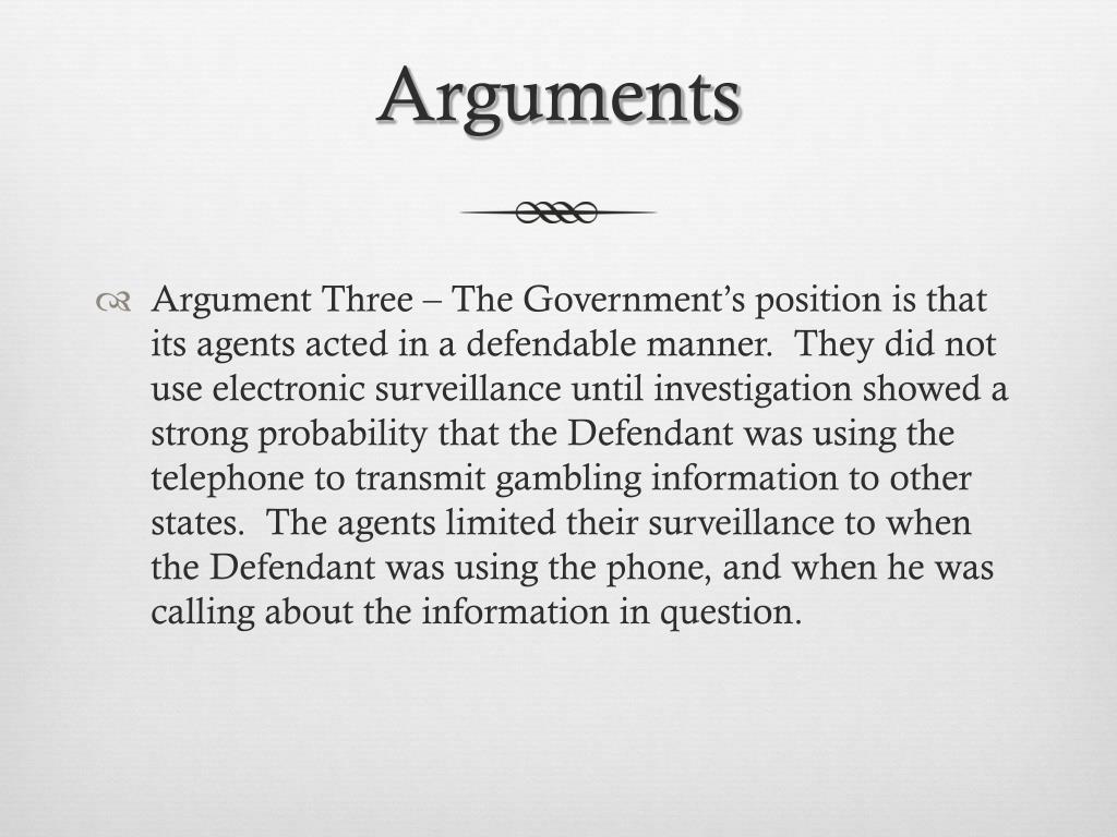 Arguments Argument Three – The Government’s position is that its agents acted in a defendable manner. They did not use electronic surveillance until investigation showed a strong probability that the Defendant was using the telephone to transmit gambling information to other states. The agents limited their surveillance to when the Defendant was using the phone, and when he was calling about the information in question.